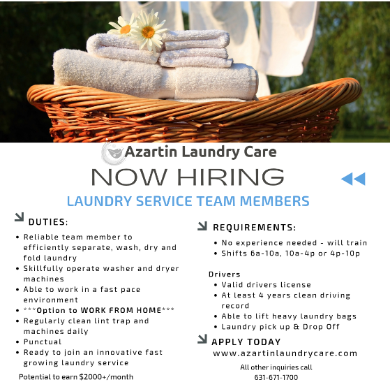 Azartin Laundry Care provides exceptional and high quality laundry service for a diverse clientele across Long Island, NY and is rapidly growing. Customer satisfaction is our number one goal. We are the solution to everyday laundry needs. Join our team helping families one load at a time.